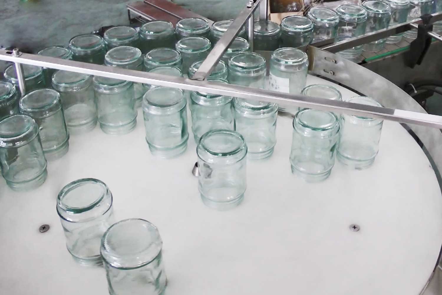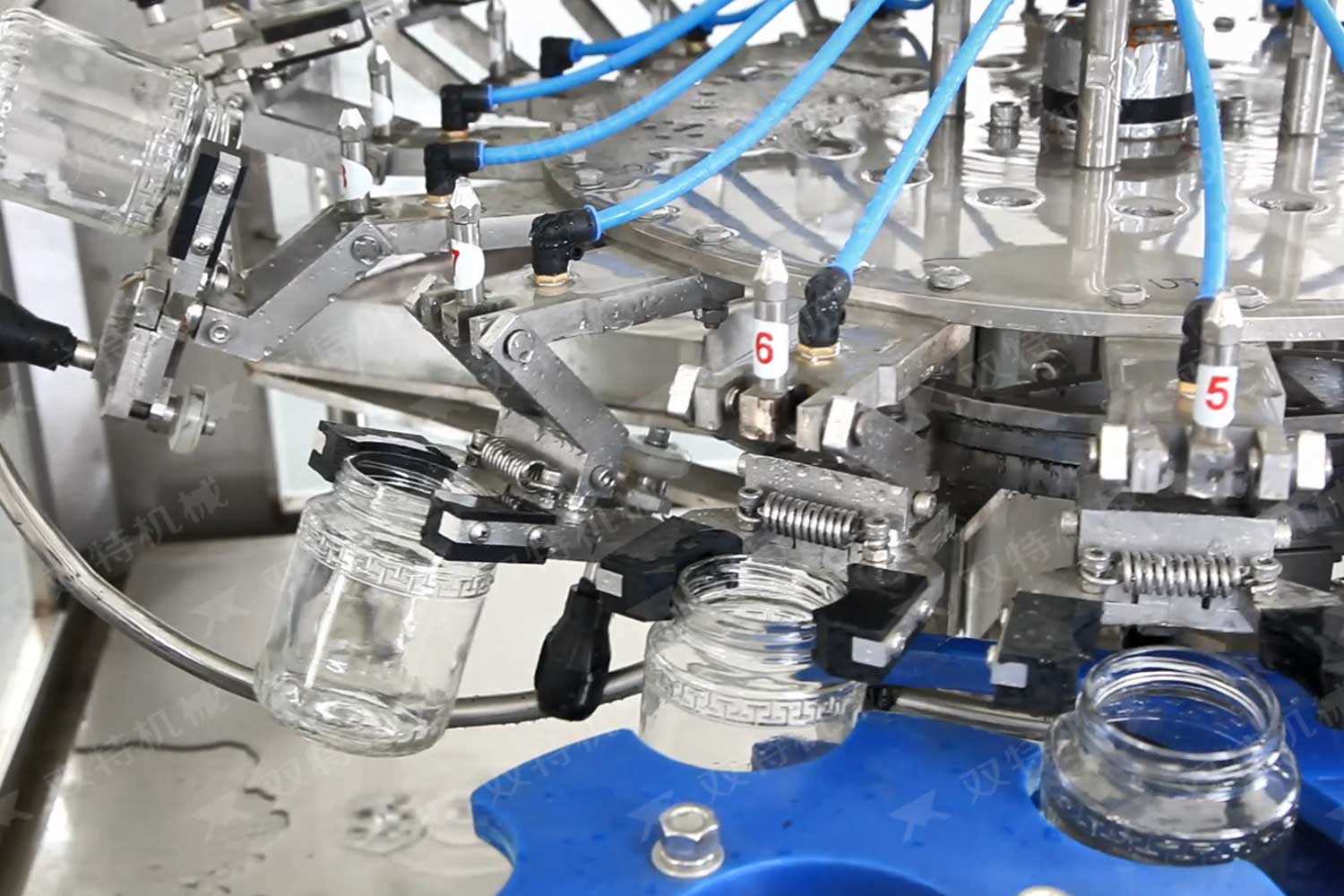 旋蓋機(jī)主要用于玻璃廣口瓶的三、四、六鐵蓋真空旋蓋,用兩根不同速度的皮帶壓瓶蓋,因兩根皮帶的速度不同,對(duì)蓋進(jìn)行搓蓋收緊達(dá)到旋蓋目的。在自動(dòng)上蓋之前對(duì)瓶口吹蒸汽加熱,吹掉冷空氣,換上高溫蒸汽,立即旋蓋,根據(jù)熱脹冷縮原理,蒸汽冷下來(lái)就自然形成了瓶?jī)?nèi)真空,達(dá)到了真空旋蓋的目的。自動(dòng)旋蓋機(jī)可以和濃醬灌裝機(jī)、蜂蜜灌裝機(jī)、辣椒醬灌裝機(jī)組合在一起,形成一套全自動(dòng)灌裝設(shè)備,是現(xiàn)代調(diào)味品企業(yè)的得力幫手。